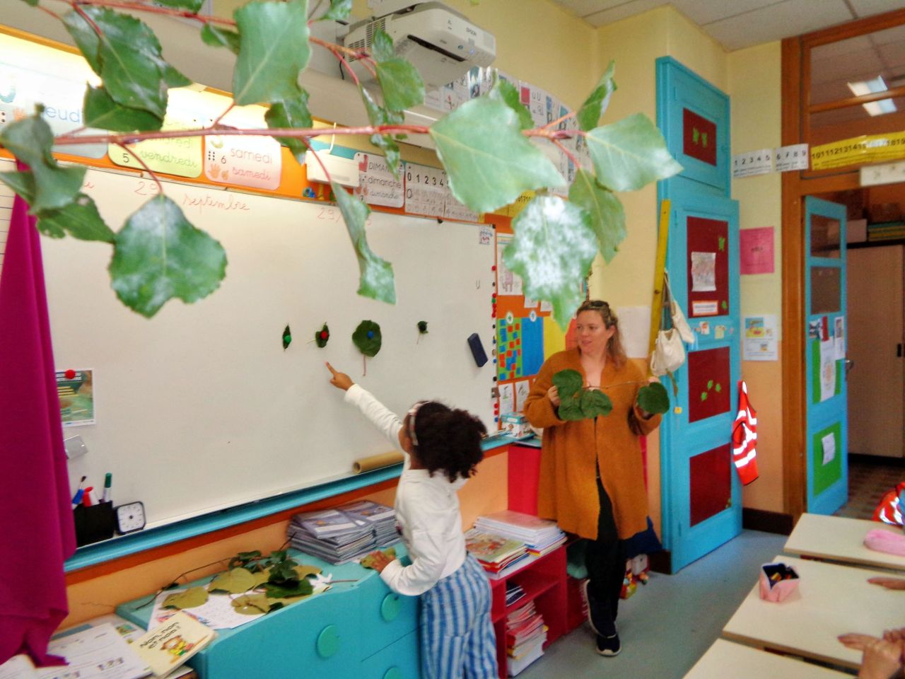 Nos petits amoureux de la nature reconnaissent les feuilles des arbres de la cour, le tilleul, le peuplier, le laurier sauce et l'arbre à kiwis !